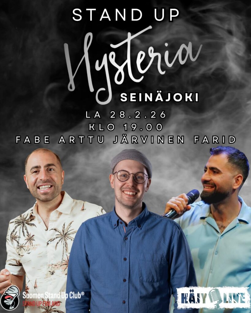 Teatteri Hysterian uudella stand up- klubilla Seinäjoella kevään toisena iltana teille esiintyvät aivan mielettömän hauskat ammattikoomikot Fabe, Arttu Järvinen ja Farid!